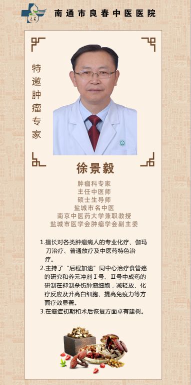 徐景毅 主任中医师,南京中医药大学兼职教授,盐城市名中医,原盐城市国家级重点专科肿瘤科主任,中国中医肿瘤学会委員,中国中医老年肿瘤学会常委,盐城市肿瘤学会副主委。主要从事肿瘤中医丶化疗、放疗临床工作。对食管癌、肺癌、乳腺癌、胃癌、胰腺癌、肠癌及脑部肿瘤等均有治疗经验。
